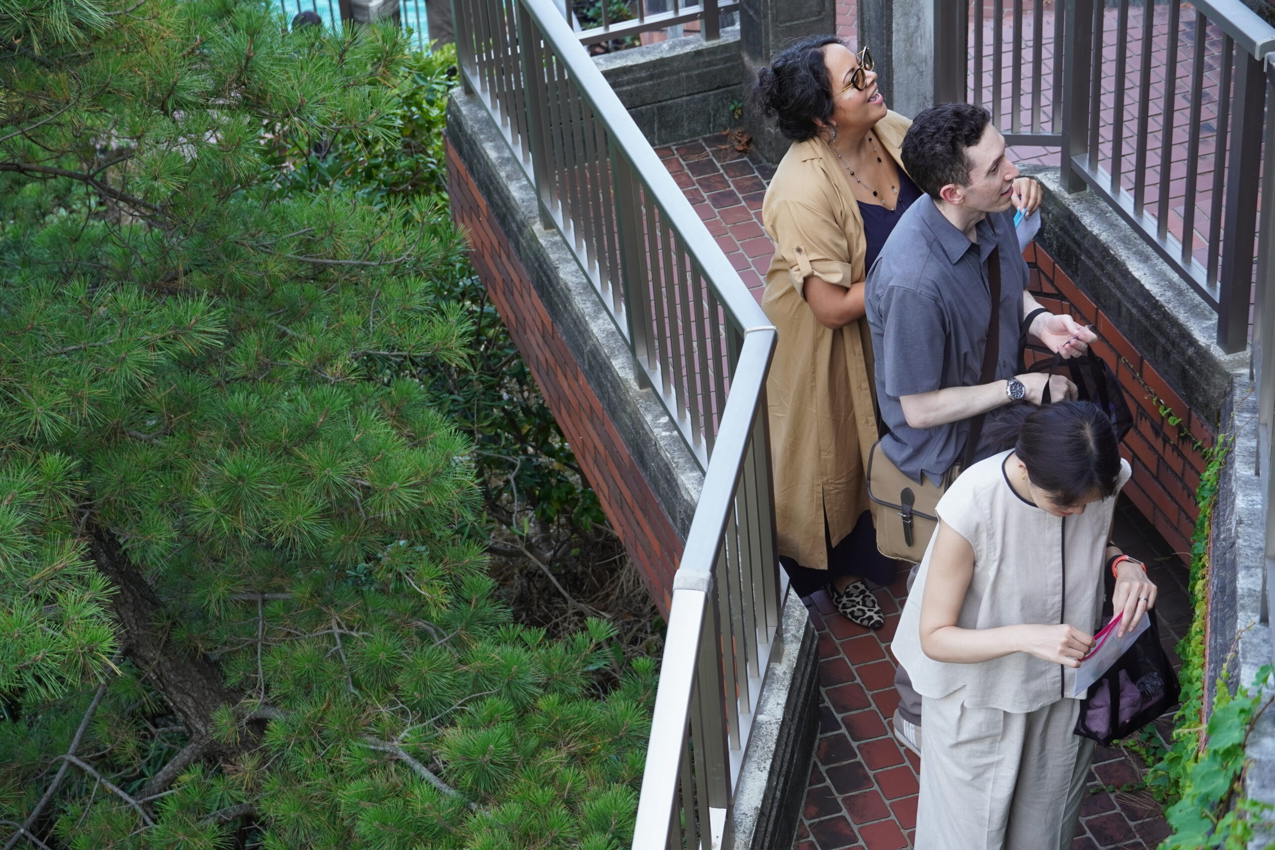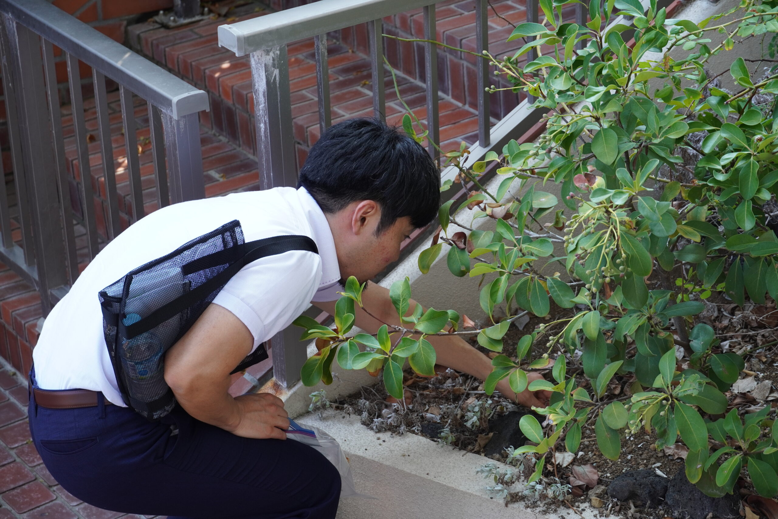 まずは「何を観察したいか」を探しに外へ出発。熱海の山林を抜け、眼下に海を望む断崖をくだりながら、子どもも大人も一緒になってサンプルを採集していきます。手に取るのは、木々の葉や小さな花びら、虫の抜け殻。中にはタバコの吸い殻や、はたまた生きたままのトンボまで(!?)。思いがけない素材が集まり、参加者たちの好奇心が一気に高まりました。