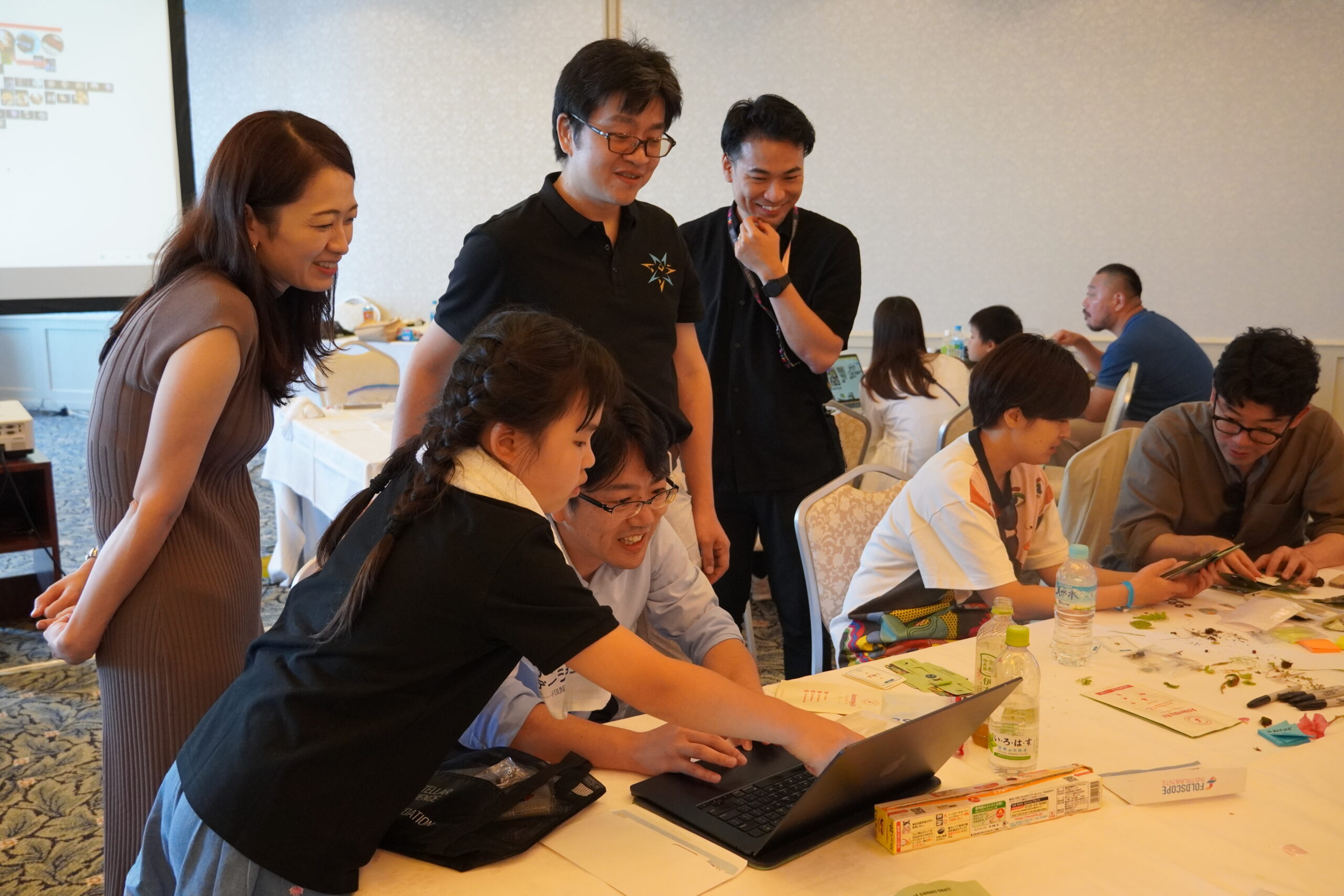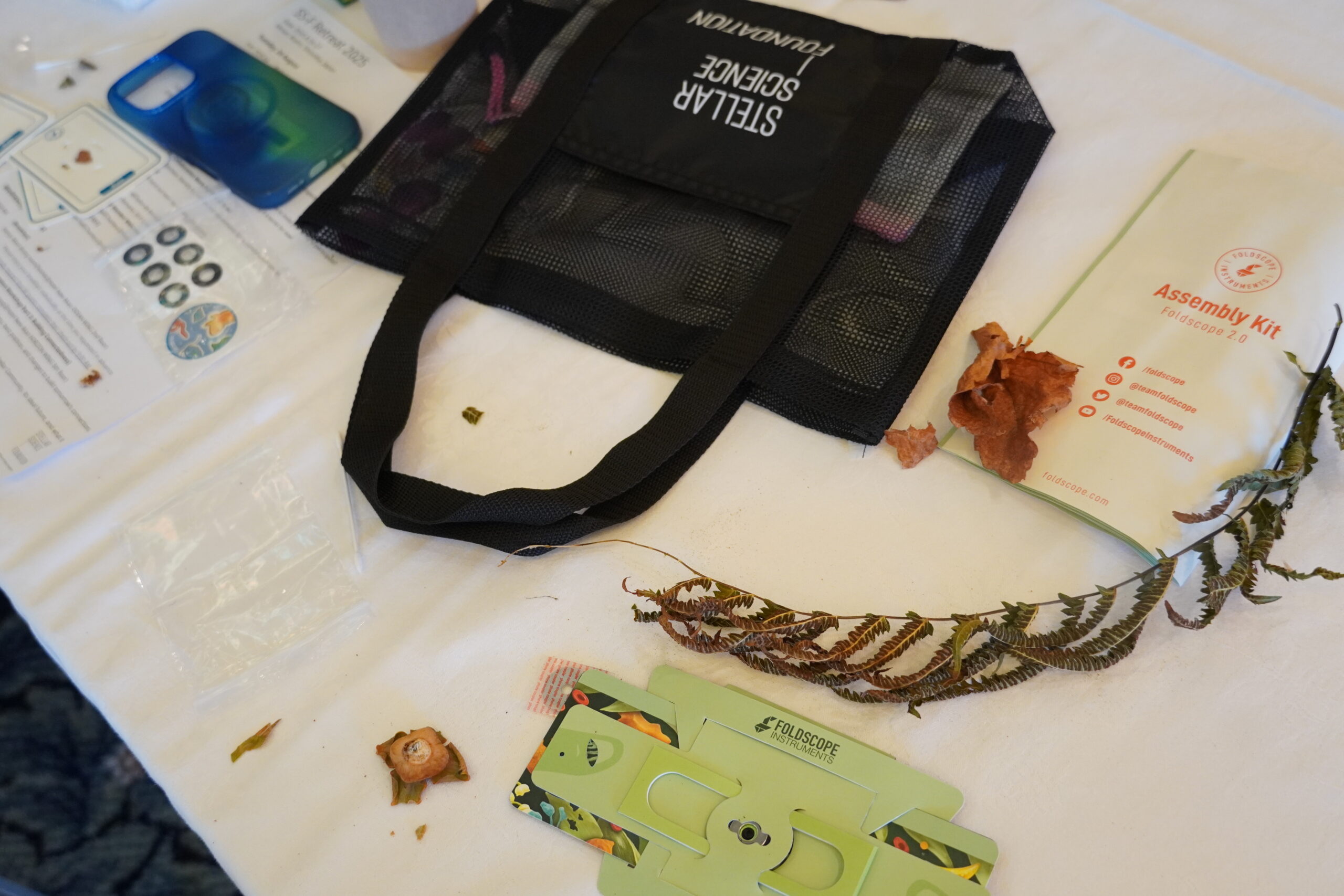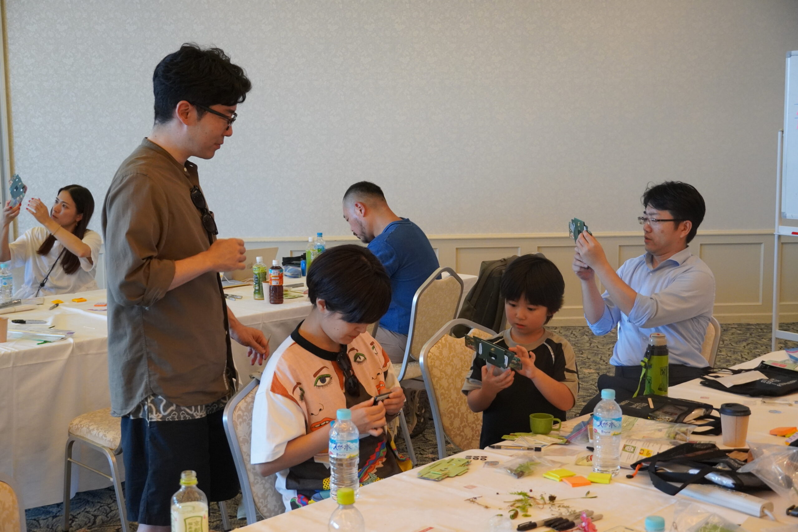その後は会議室に戻り、Foldscopeを手に各自で観察を開始。視界がクリアに広がった瞬間には「見えた!」「おお〜」と歓声が上がり、大人も子どもも夢中で顕微鏡を覗き込みました。同じ葉を持ち帰っていても、切り取り方や観察する角度によって見える世界はまったく違います。それぞれの参加者が、それぞれの視点でユニークな「発見」を生み出していきました。