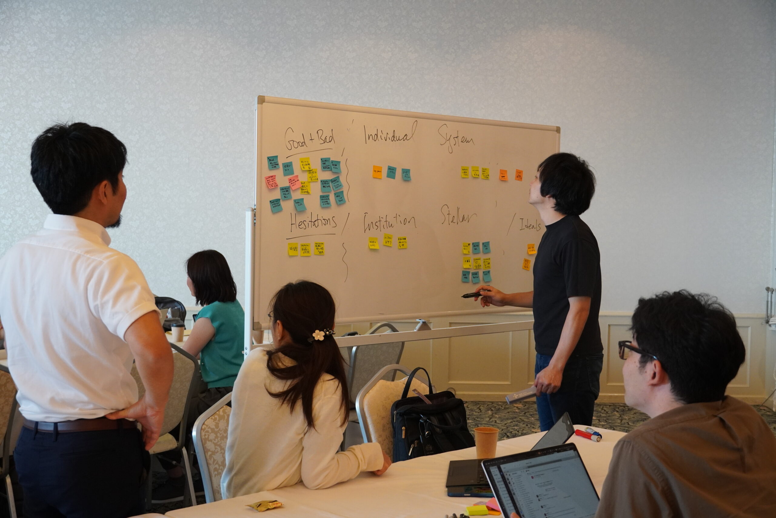 自己紹介を終え、最初のセッションでは、これまでに行ったことのある「過去のコラボレーション経験(=共同研究など)」をグループに分かれて、振り返りました。